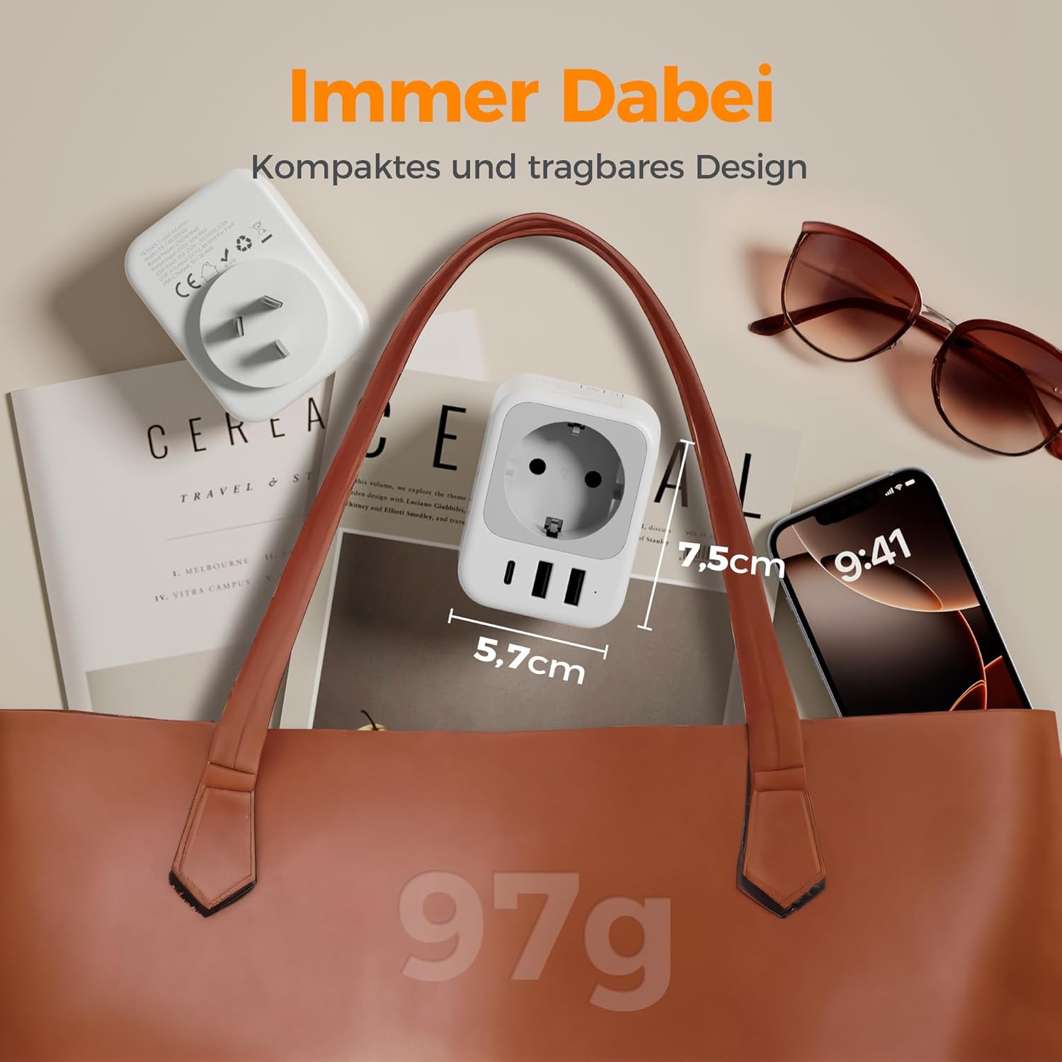 Bei Fernreisen zählt jedes Gramm. Mit einem Gewicht von nur 97g und den kompakten Maßen von 7,5 x 5,7 x 7 cm verschwindet dieser Adapter förmlich in Ihrem Rucksack. Er entlastet Ihr Reisegepäck und sorgt für Ordnung, da Sie keine zusätzlichen USB-Netzteile mehr benötigen.
