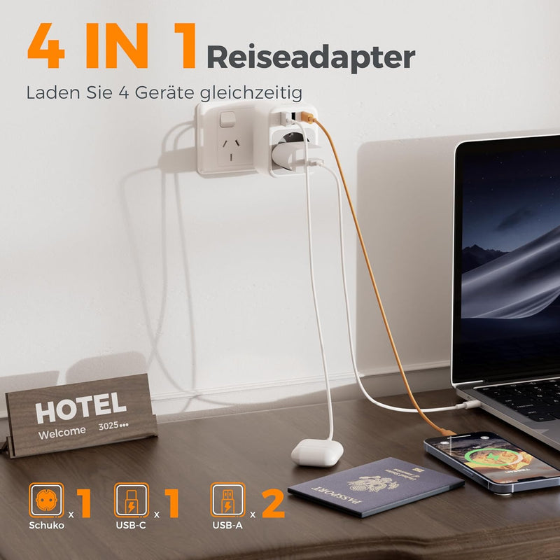 Steht Ihr nächstes großes Abenteuer in Down Under bevor oder planen Sie eine Geschäftsreise nach China? Der TESSAN Typ I Reiseadapter ist genau darauf ausgelegt, Ihnen den Stress bei der Stromversorgung zu nehmen. Er verwandelt eine einzelne lokale Steckdose in eine leistungsstarke Ladestation für bis zu vier Geräte gleichzeitig – damit Sie sich voll und ganz auf Ihre Reise konzentrieren können.