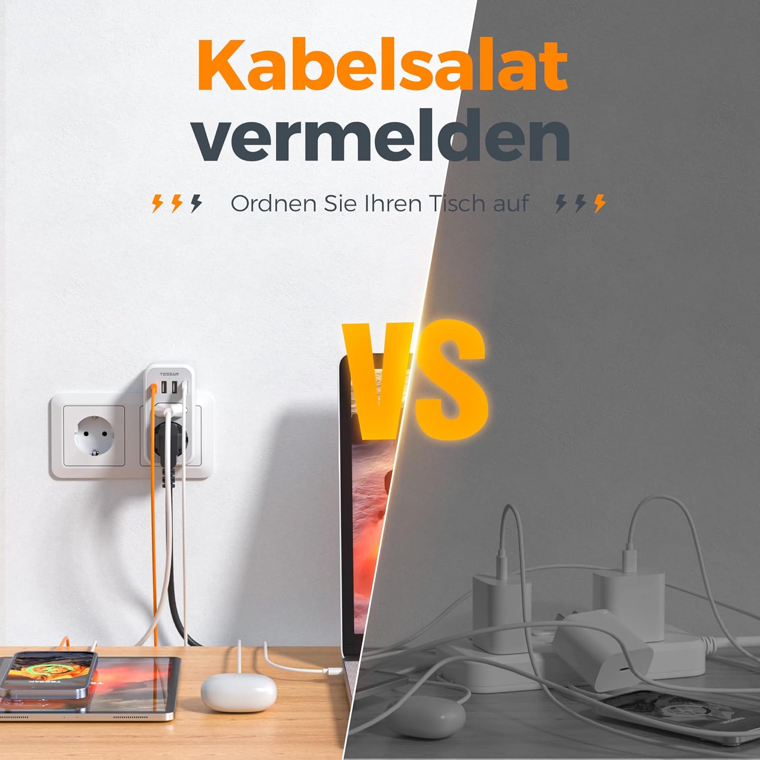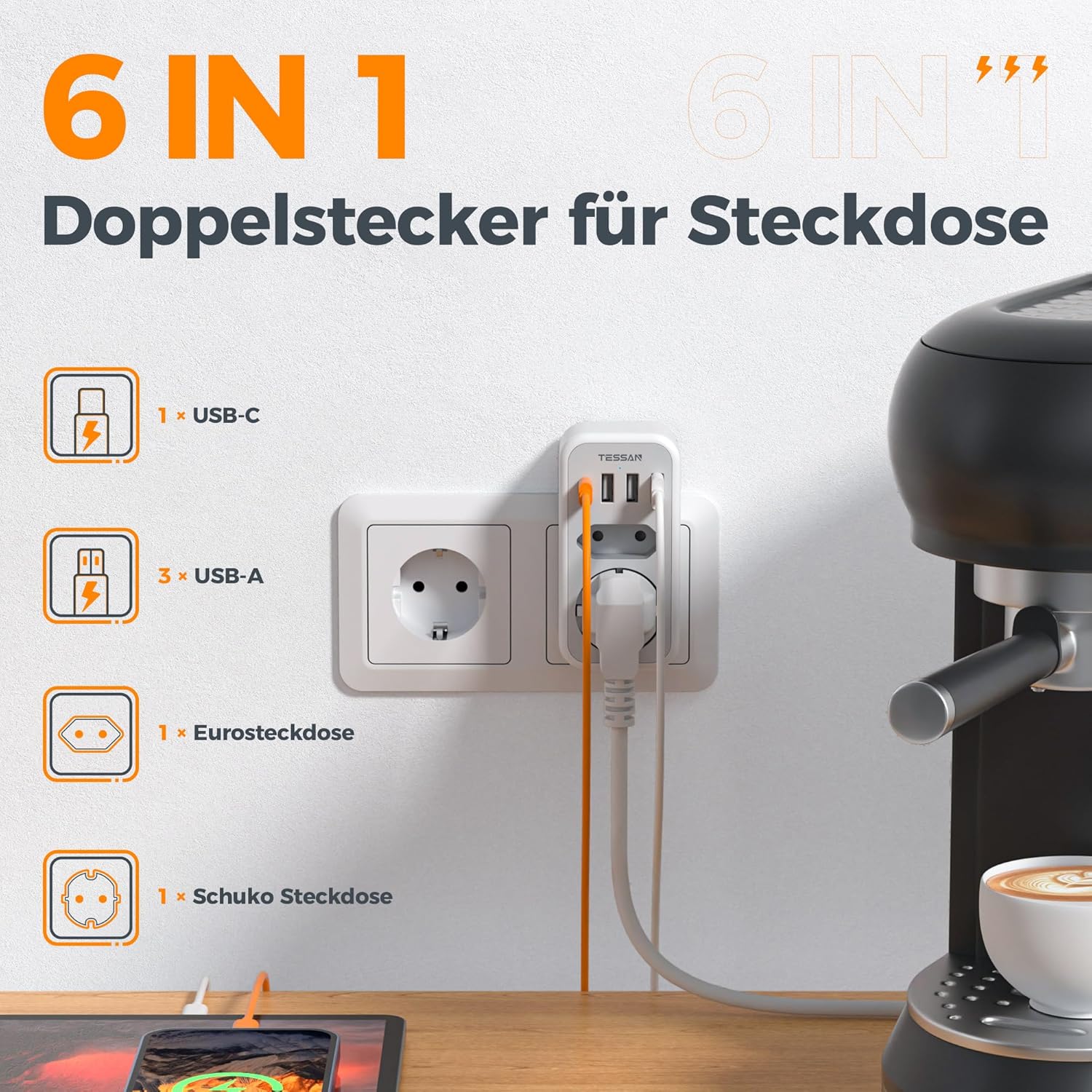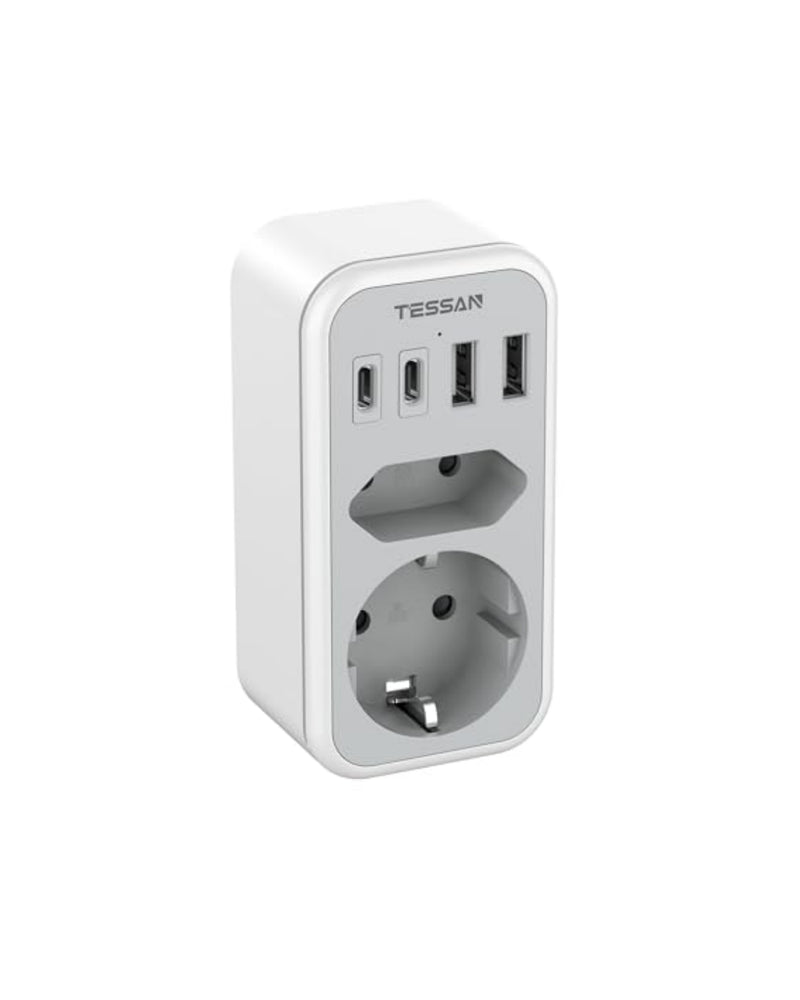 Diese TESSAN 2-fach Steckdose mit USB ist eine praktische Lösung, um eine einzelne Wandsteckdose effizient zu erweitern. Sie kombiniert eine Schuko-Steckdose, eine Euro-Steckdose und vier USB-Anschlüsse in einem kompakten Gehäuse und eignet sich ideal für den täglichen Einsatz zu Hause, im Büro oder im Studentenwohnheim.