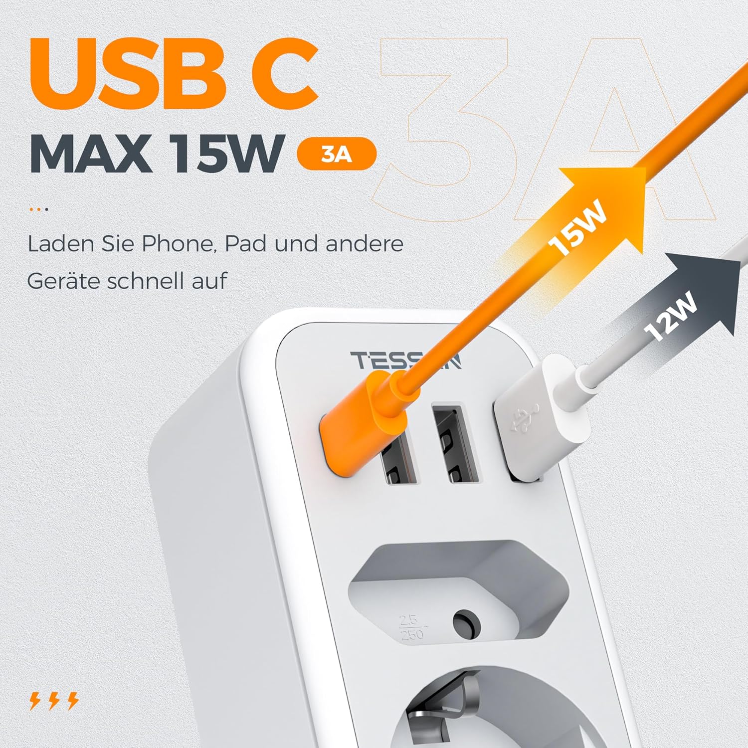 TESSAN Mehrfachsteckdose 2-fach mit USB-C, 3600W