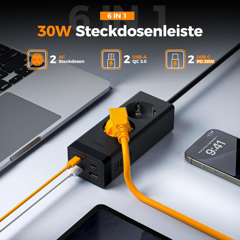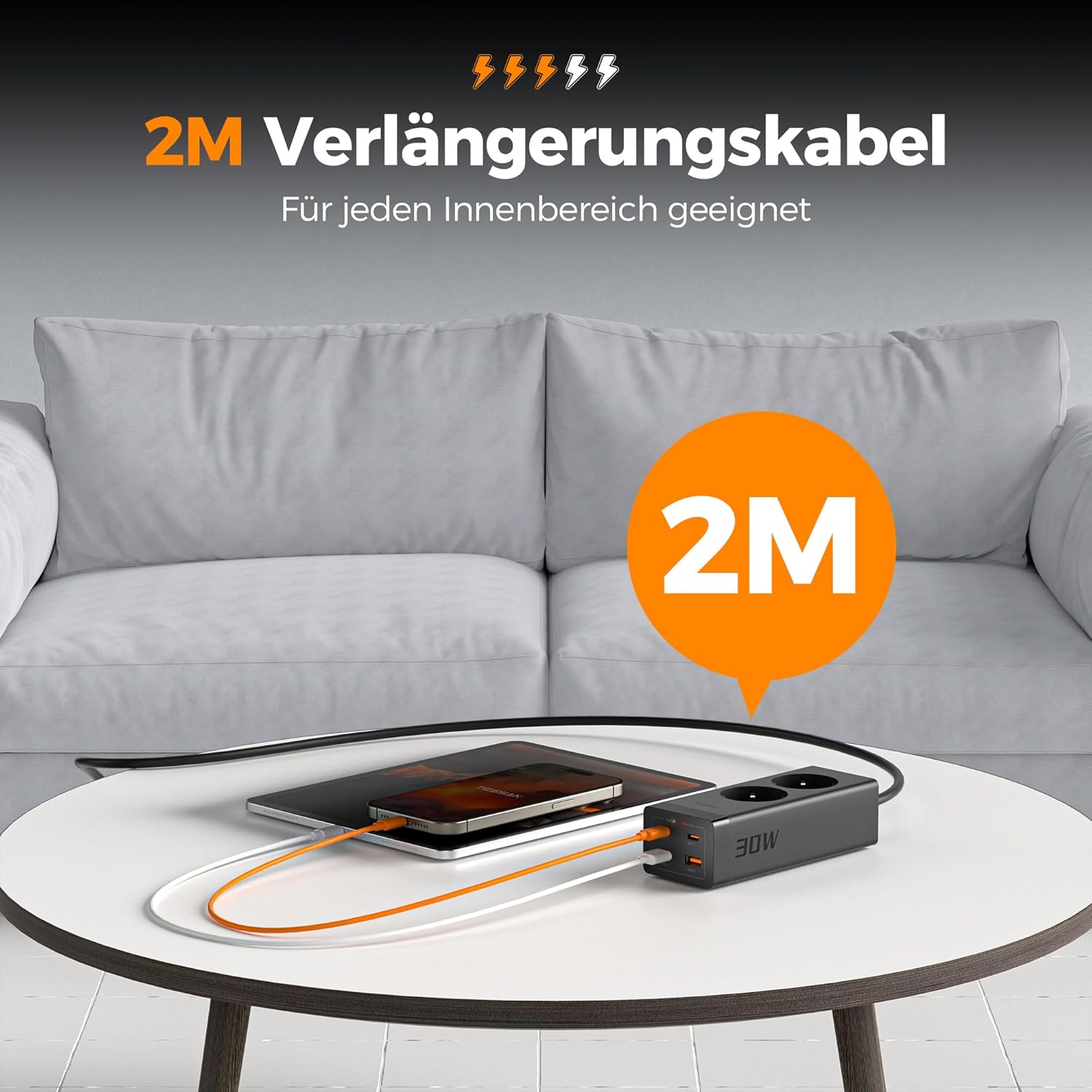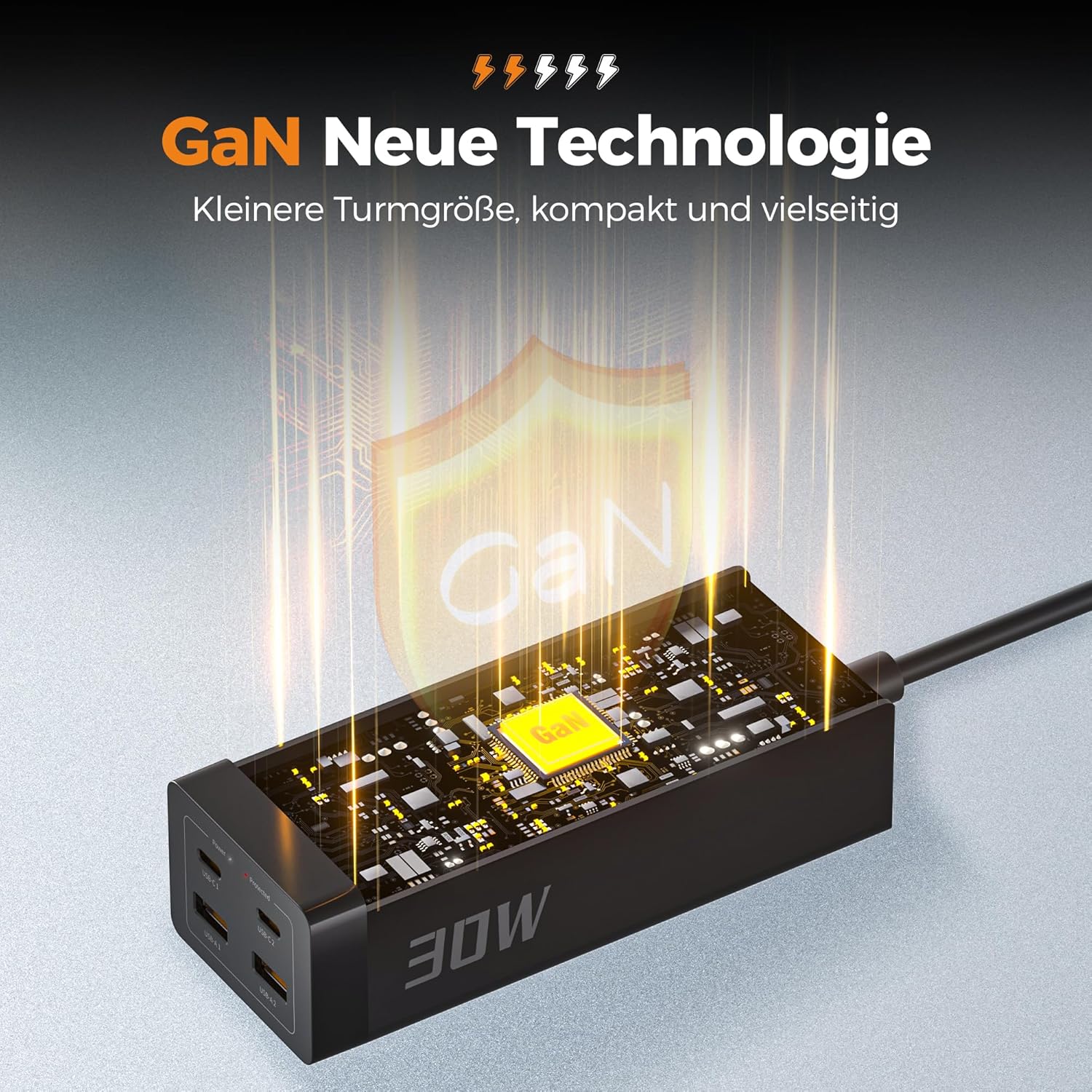 Revolutionieren Sie Ihren Schreibtisch: Ausgestattet mit modernster GaN-Technologie bietet diese 6-in-1 Mehrfachsteckdose blitzschnelles 30W PD-Laden für Ihre Mobilgeräte – kompakter und effizienter als jemals zuvor.