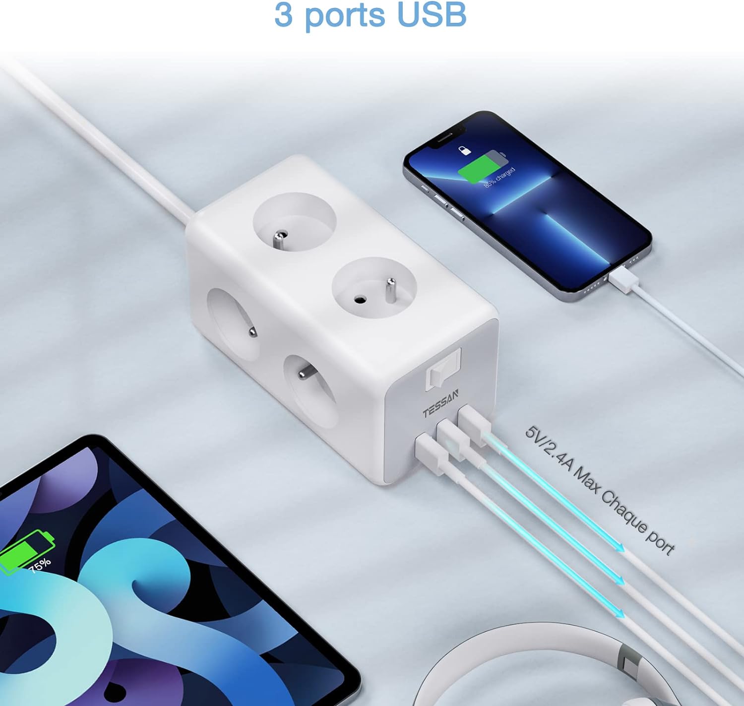 - 6 französische Steckdosen mit 3 USB: Die 6 auf drei Seiten verteilten Steckdosen der TESSAN Steckdosenleiste sind weit verbreitete Steckdosen für große Adapter, die sich nicht gegenseitig stören, selbst wenn mehrere Standardsteckdosen gleichzeitig verwendet werden. Es kann nicht nur bis zu 4000 Watt Strom tragen, sondern verfügt auch über 3 USB-Ladegeräte.