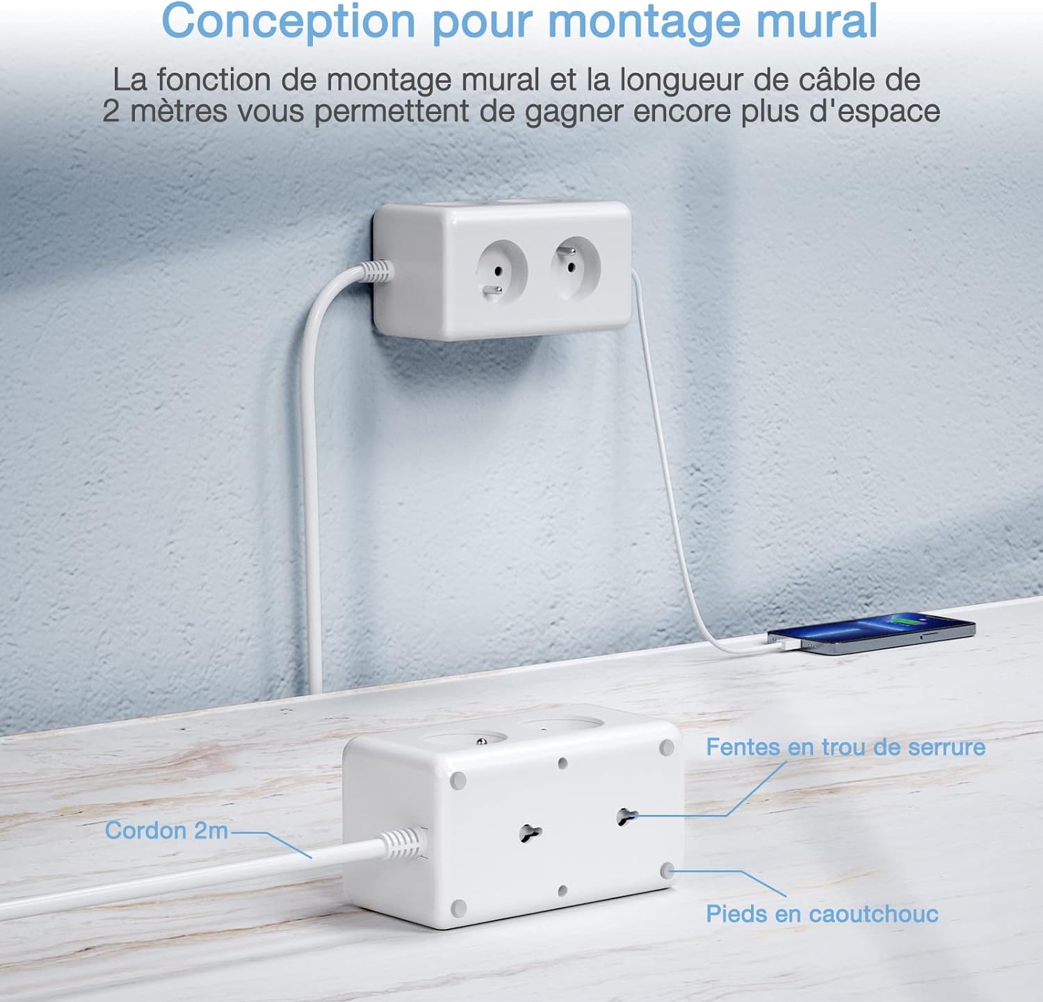- Verlängerungskabel 2 m: Die Mehrfachsteckdose verfügt über eine Verlängerung von 2 m und ist mit Schutzkontakten für die Verwendung mit französischen Standardsteckern ausgestattet und kompatibel mit normalen europäischen Steckdosen.
