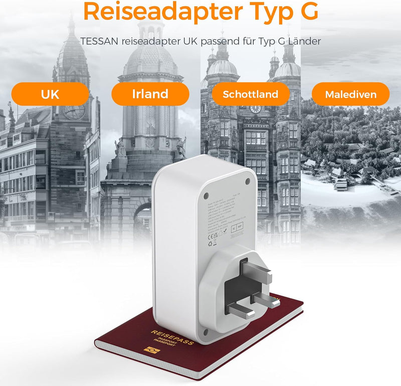 - Warme Tipps: Der USB C Adapter steckdose ist kein Spannungswandler. Stellen Sie sicher, dass Ihr Gerät über einen Eingangsspannungsbereich von 100 bis 250V verfügt und die maximale Leistung des TESSAN Adapter London Steckdose 3250W beträgt.