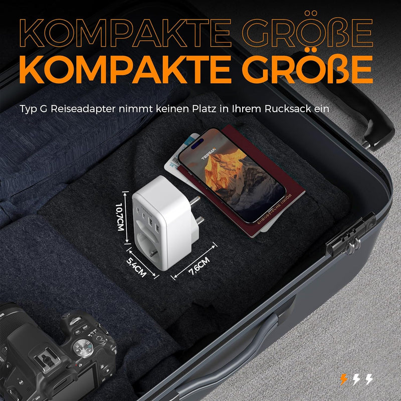 Typ G Reiseadapter nimmt fast keinen Platz in Ihrem Koffer ein und macht das Reisen einfacher.