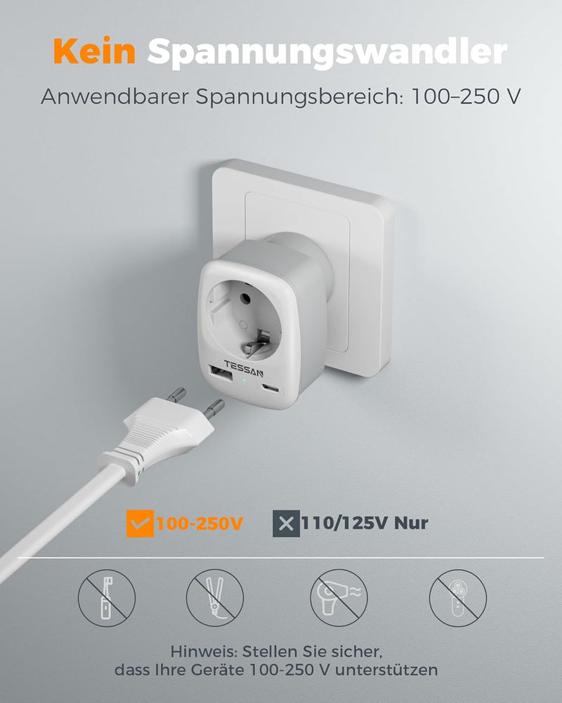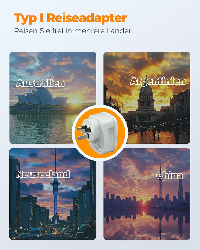 Träumen Sie von einem Roadtrip durch das Outback oder einer Entdeckungstour durch Neuseeland? Der TESSAN Typ I Reiseadapter sorgt dafür, dass Ihre Technik auch am anderen Ende der Welt nie ohne Strom dasteht. Mit seinem durchdachten 3-in-1 Design ist er die perfekte Brücke zwischen Ihren gewohnten deutschen Steckern und dem lokalen Stromnetz.