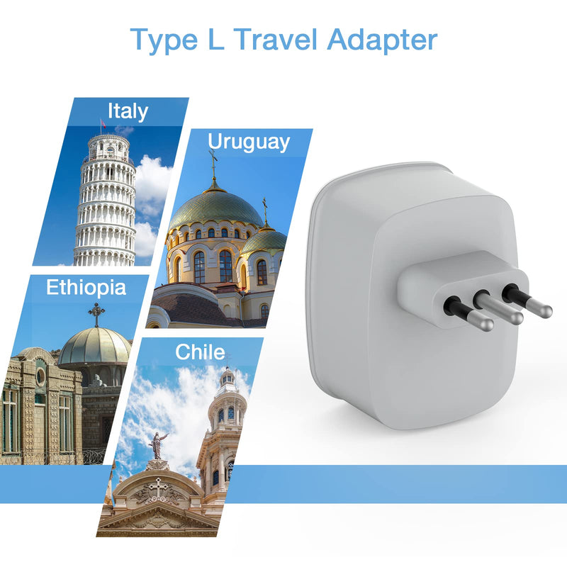 Travel adapter to convert C/E/F plugs into L connectors. For all your charging needs. This plug is for Italy, Chile, Uruguay, Ethiopia, Eritrea, Syria, Libyan Arabic Jamahiriya, San Marino, etc.