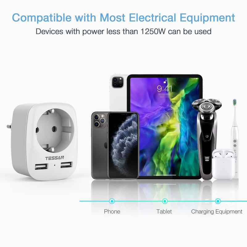 Suitable for most devices, compatible with most devices such as tablets, smartphones, razors, cameras etc. For all your charging needs during your trip and saves you a lot of space in your luggage without having to take additional adapters or sockets.