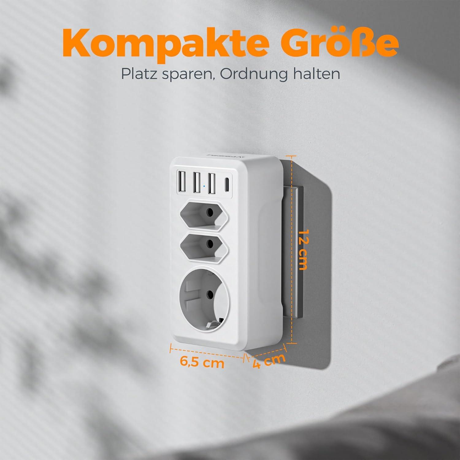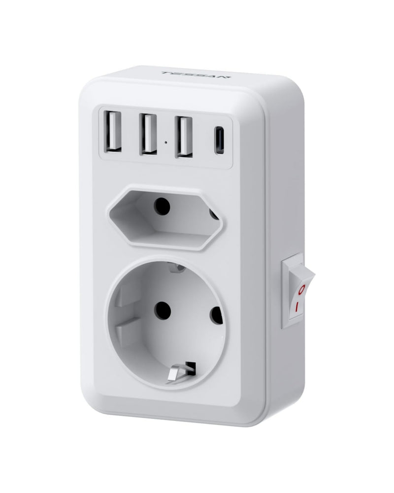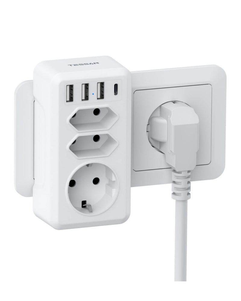 Diese TESSAN Mehrfachsteckdose ohne Kabel bietet eine praktische Lösung, um eine einzelne Wandsteckdose effizient zu erweitern. Je nach Variante verwandelt sie eine Schuko-Steckdose in zusätzliche Euro-Steckdosen sowie 4 USB-Anschlüsse (3× USB-A und 1× USB-C) – ideal, um mehrere Geräte gleichzeitig mit Strom zu versorgen.