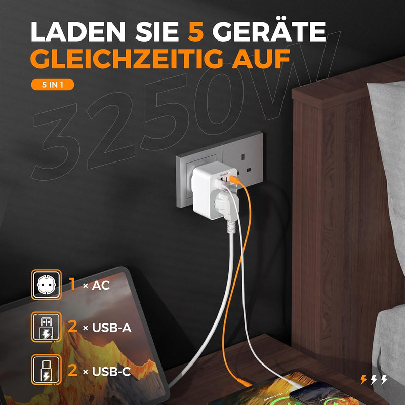 Mit einer Belastbarkeit von bis zu 3250W (13A) bietet der TESSAN Adapter genügend Reserven für leistungsstarke Geräte wie Laptops oder Reise-Föhne. Das robuste Gehäuse schützt Ihre Hardware zuverlässig vor Überlastung.