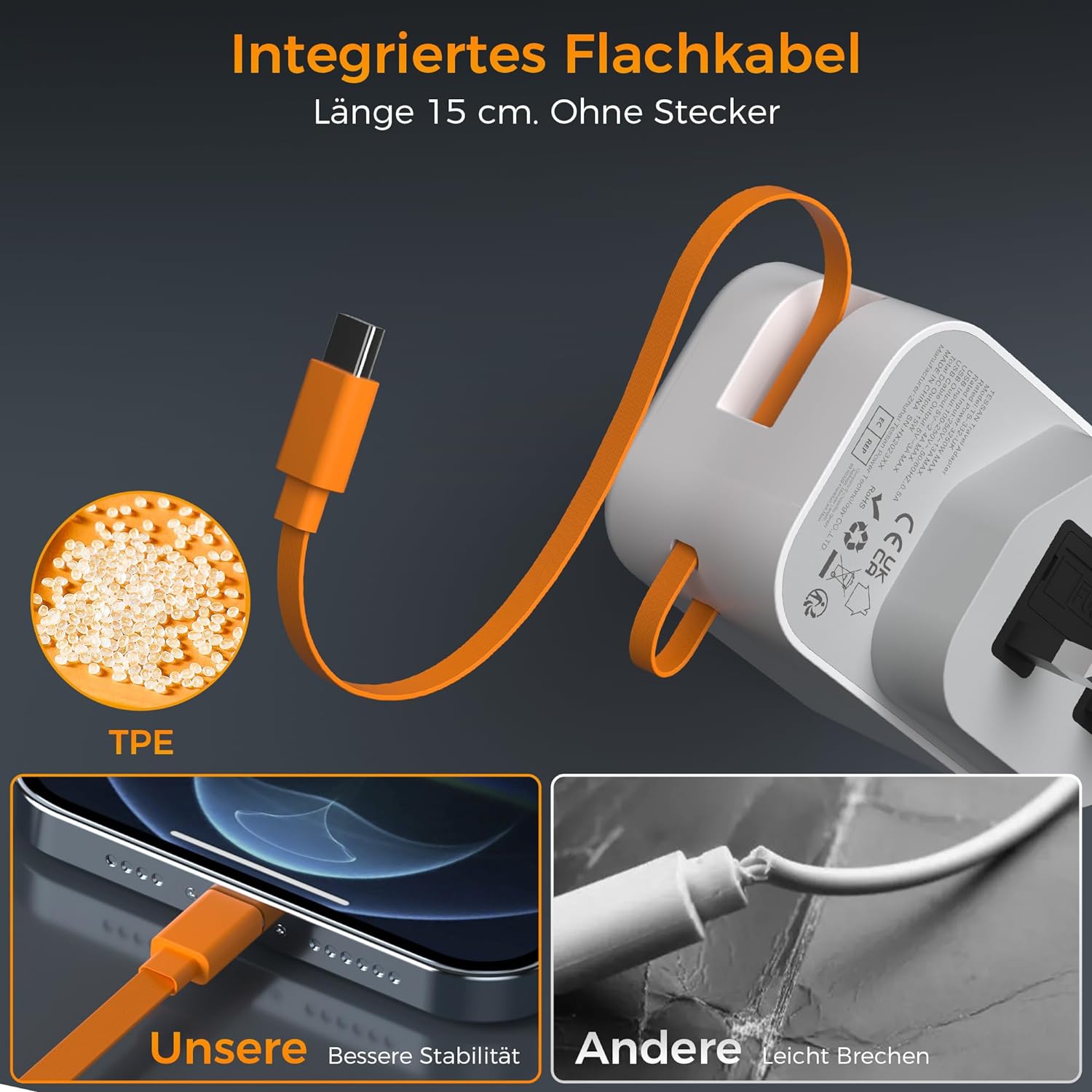 Der Adapter Steckdose England wird mit einem 15cm usb c ladekabel geliefert