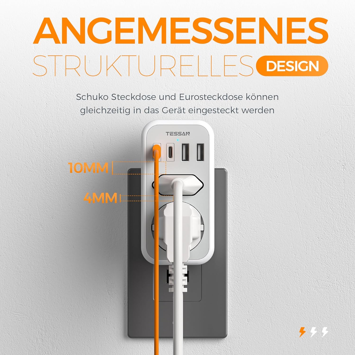 Der Reiseadapter USA blockiert nicht die Wandsteckdose, und der Abstand zwischen den Kabeln ist angemessen.