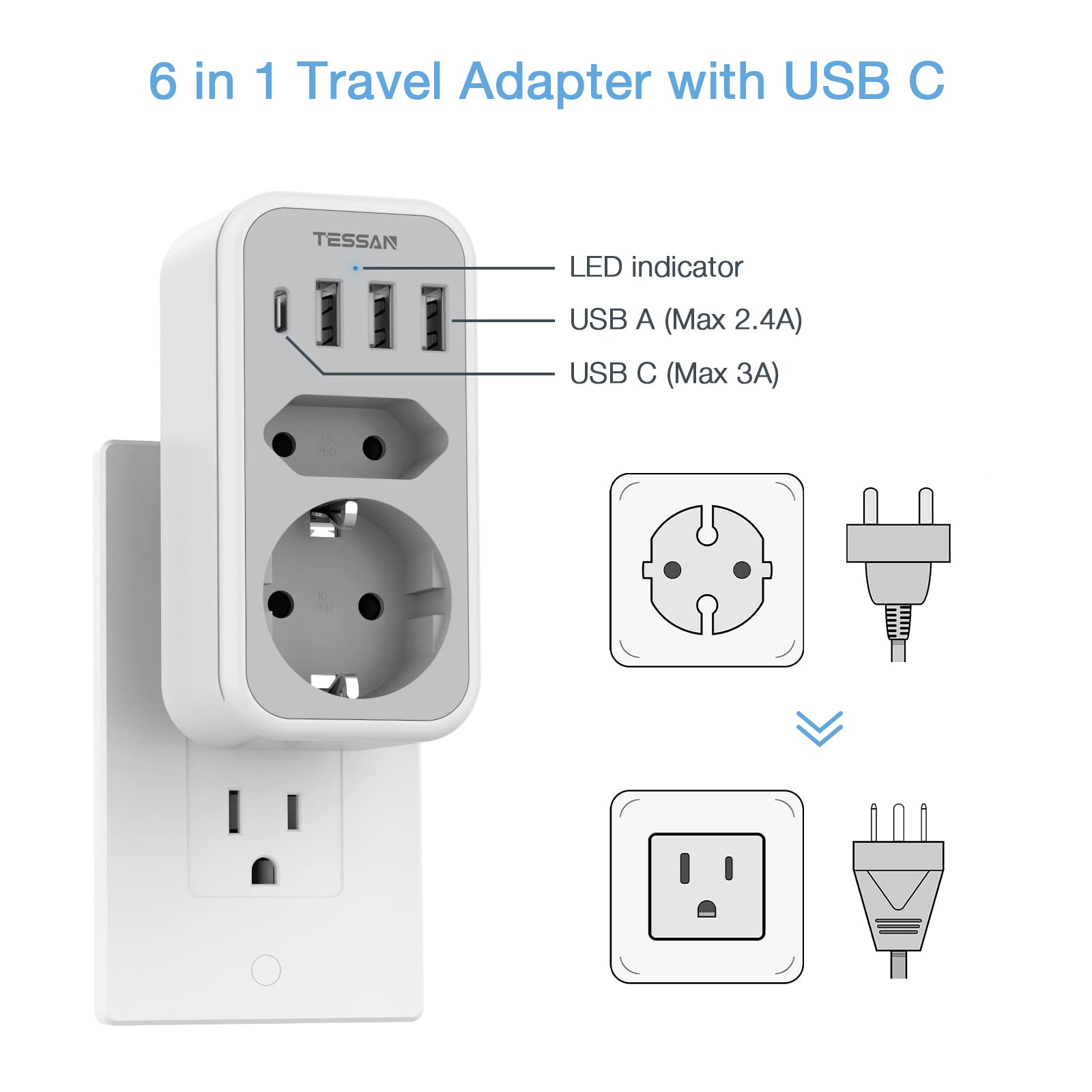- 6-in-1-Design-USA-Adapter. Dieser USA-Steckdosenadapter dient zum Anschluss von Geräten mit deutschen Schutzkontaktsteckern, Konturen und europäischen Steckern mit USA-Steckdose (Typ B). Max. Leistung bis zu 1875 Watt (max. 125 V, 15 A). 3 USB-Anschlüsse können mit bis zu 2,4 A aufgeladen werden, 1 USB-C-Anschluss kann mit bis zu 3 A aufgeladen werden.