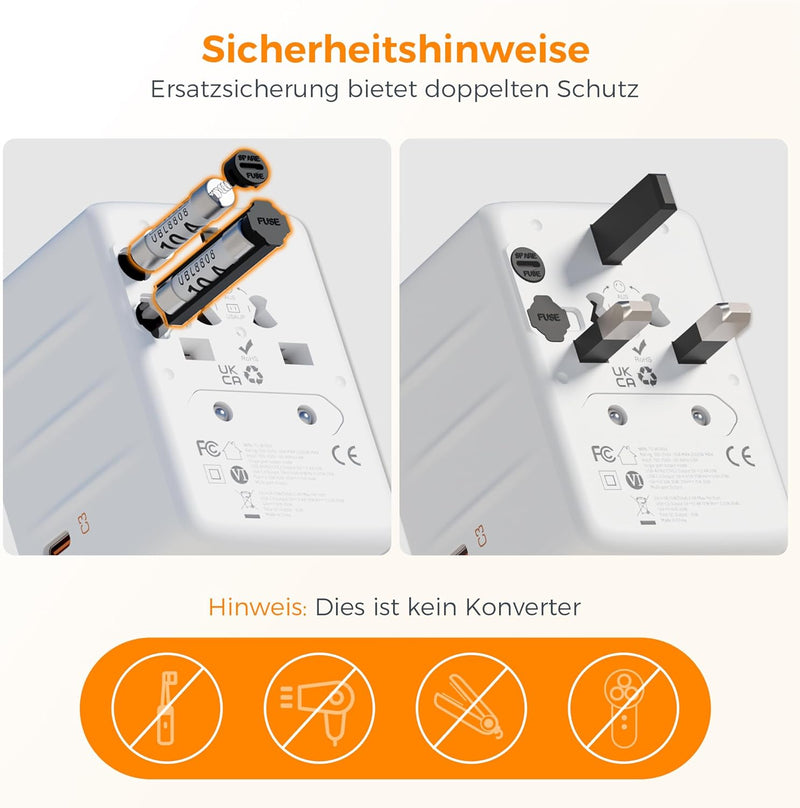 Dieser stromadapter weltweit verfügt über 2 Sicherungen. Mit einer Ersatzsicherung ist Ihre Reise doppelt versichert.