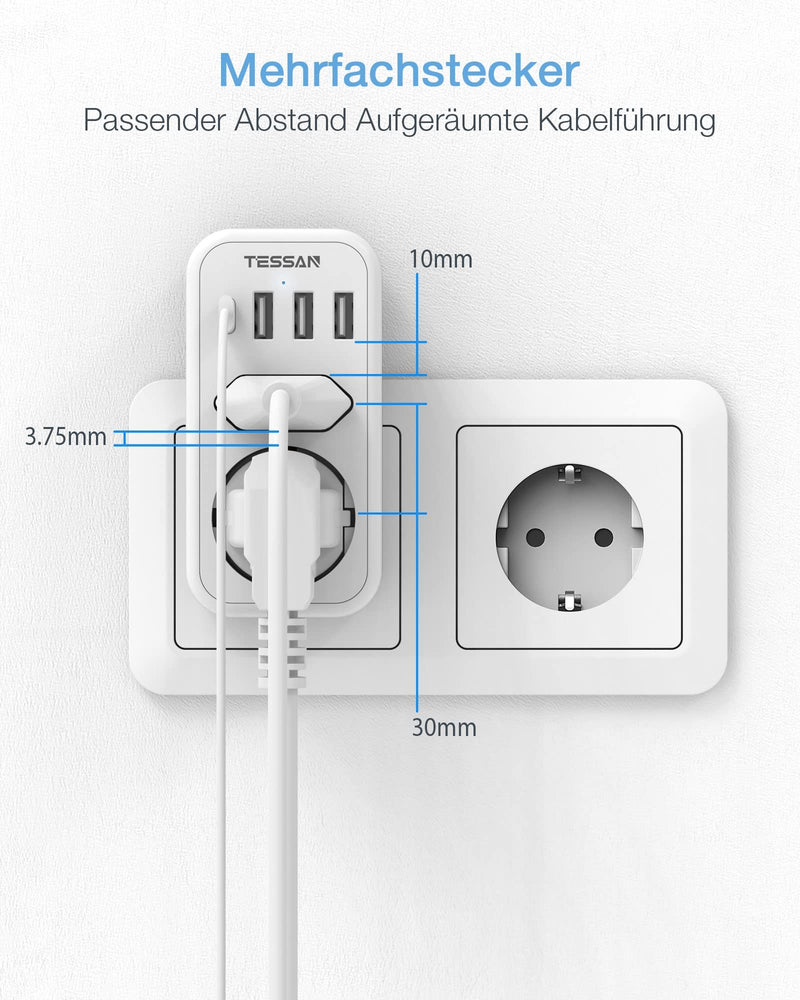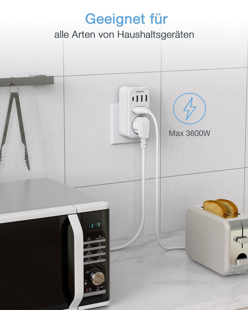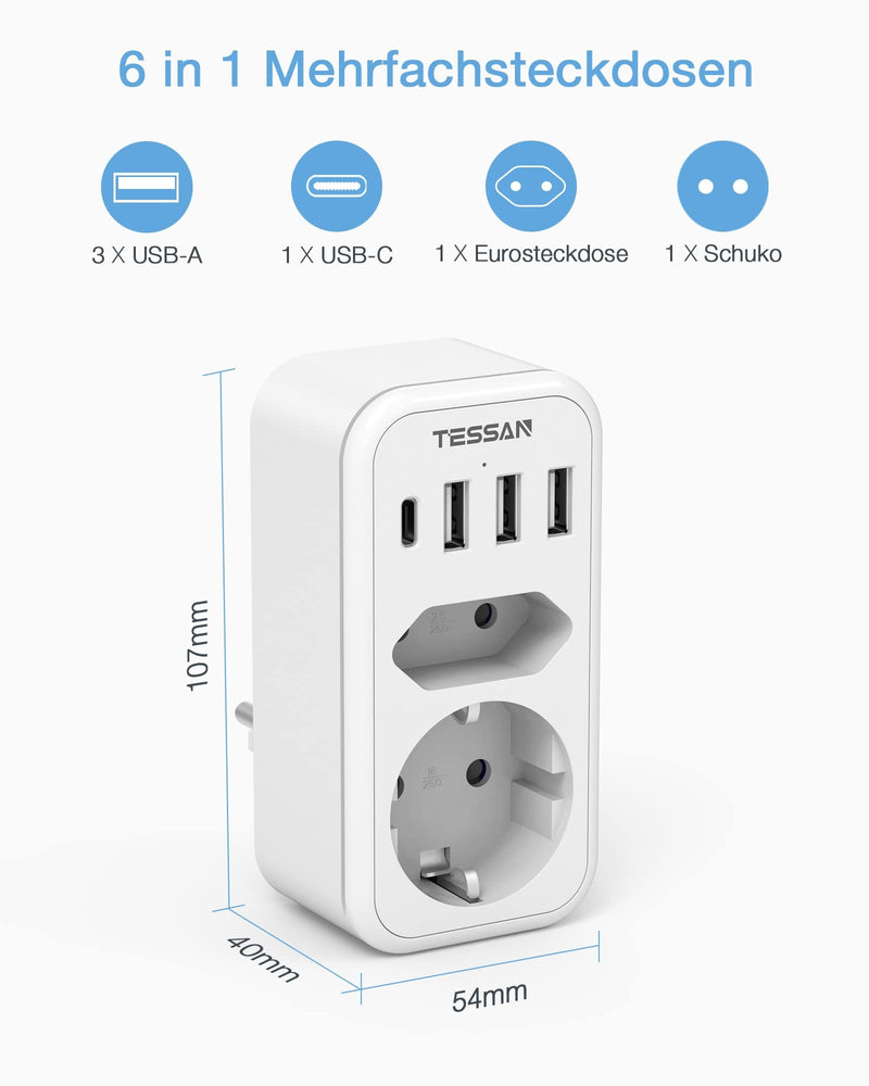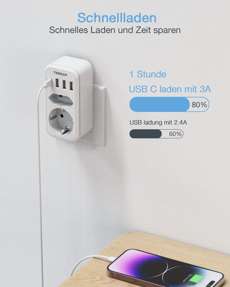 - Passend für alle Gelegenheiten: Der TESSAN Doppelstecker für Steckdose 2-fach ist in jedem Innenbereich einsetzbar. Es kann 1 Steckdose direkt in 2 Steckdosen mit unterschiedlichen Ladeanforderungen umwandeln. Das USB-C-Schnellladegerät ist viel schneller, spart Ihnen Zeit und deckt Ihren Ladebedarf überall ab.