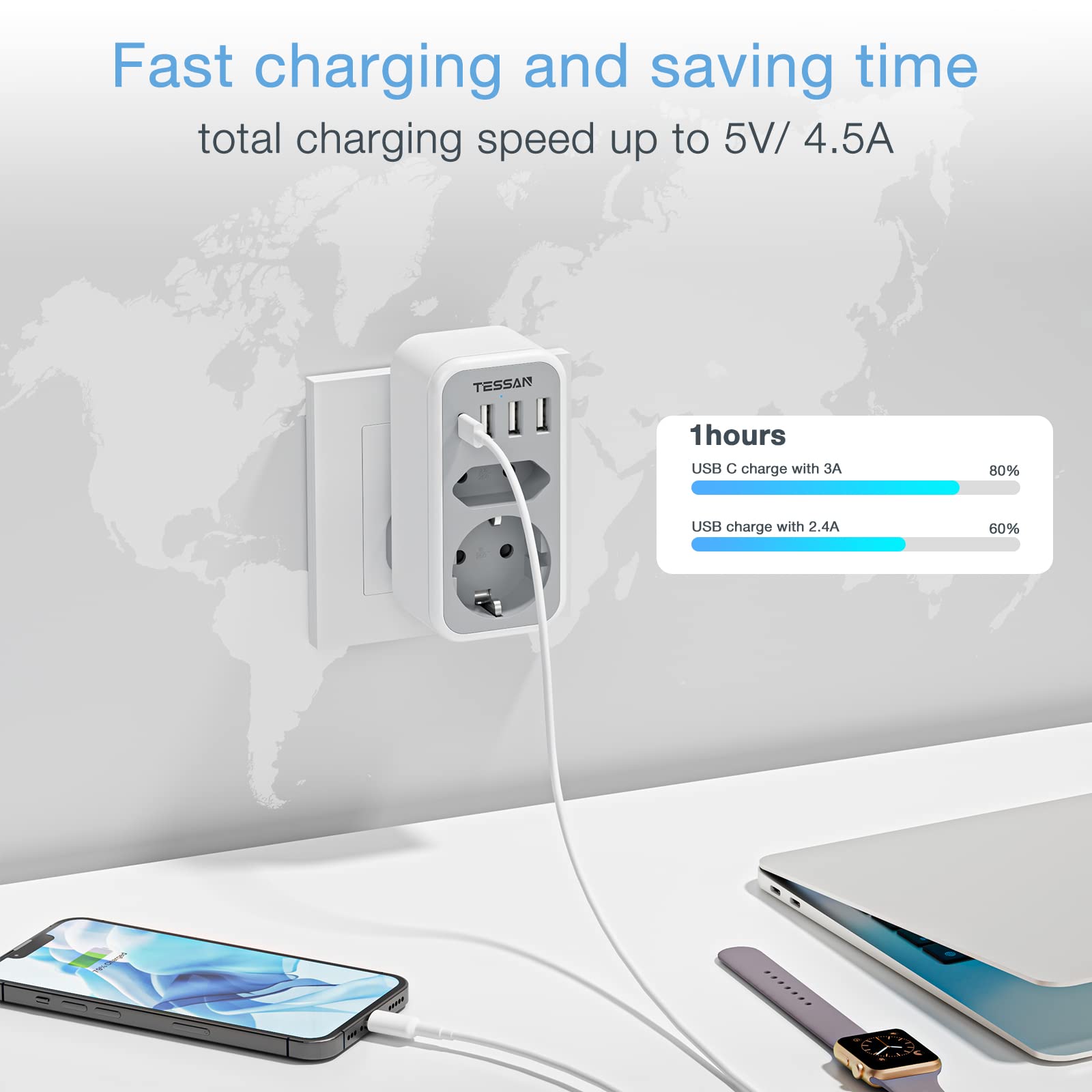 The UK power adapter can provide the fastest current of up to 3A for the USB C port. It is faster than ordinary socket adapters and save your travel time.