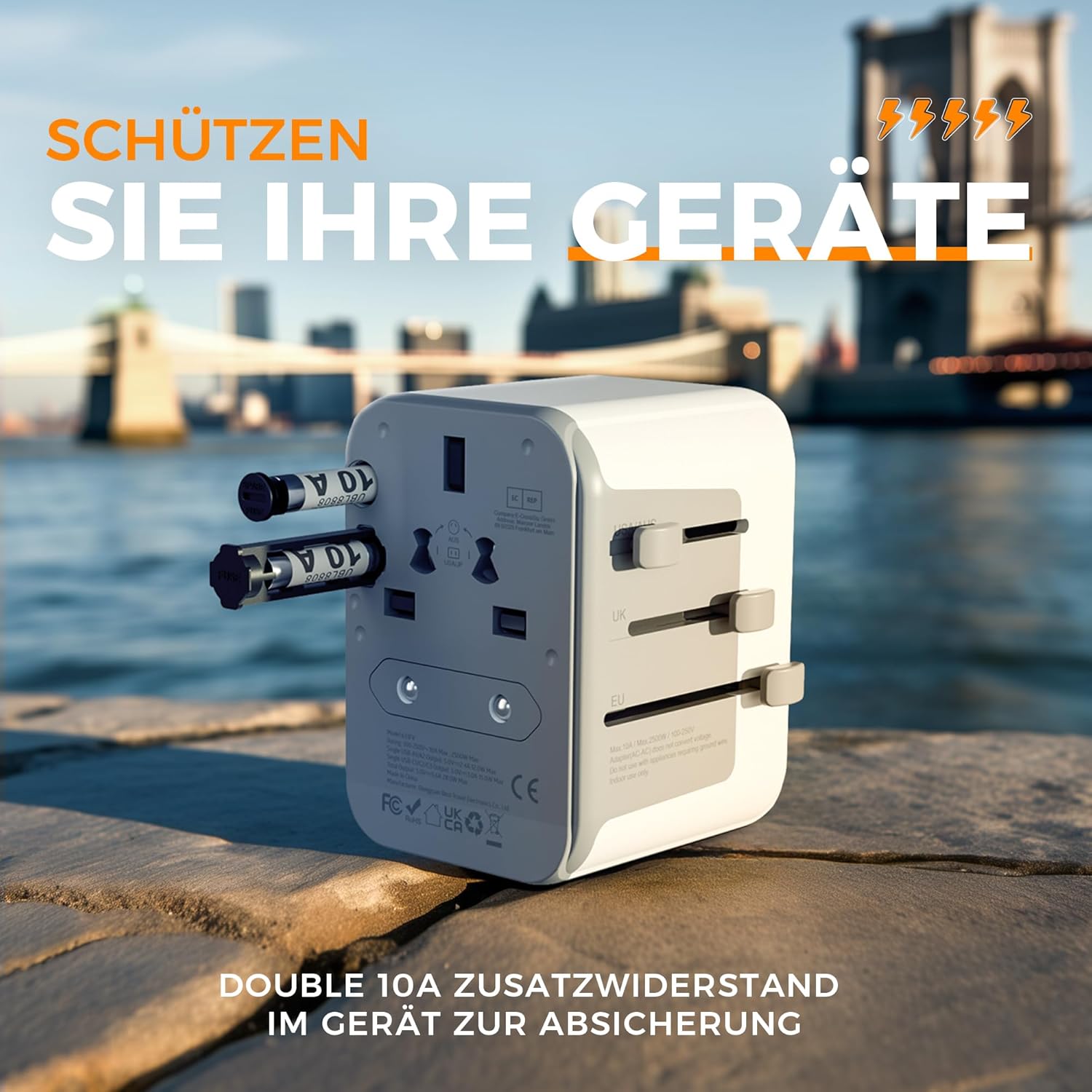 Zwei 10A Sicherungen: Unser Adapter ist mit zwei Überlastsicherungen ausgestattet. Sollte eine Sicherung auslösen, haben Sie die Ersatzsicherung direkt im Gerät dabei.